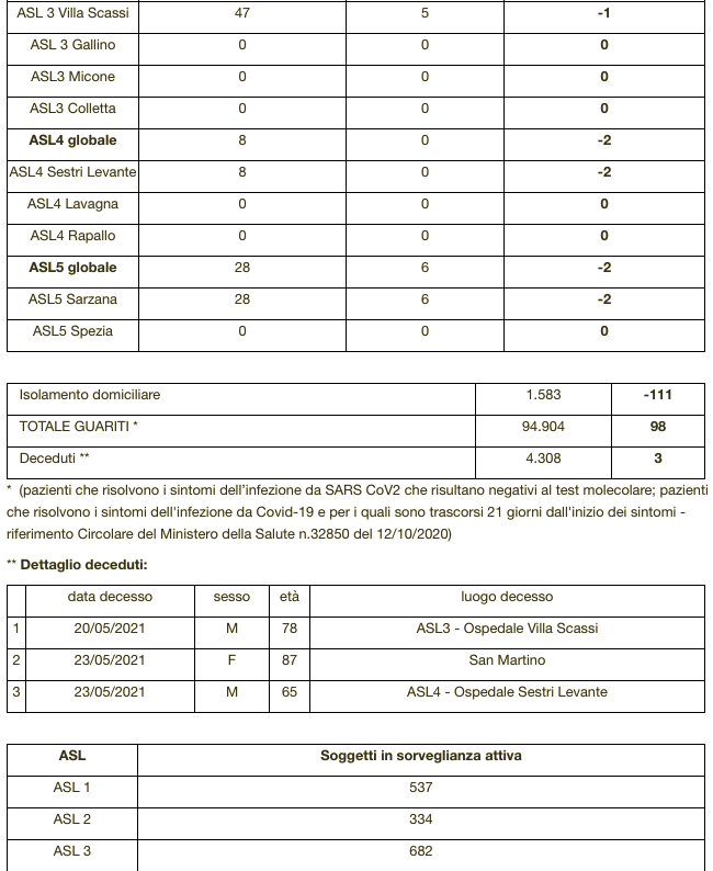 Sono 4.308 i morti con coronavirus in Liguria, con un aumento rispetto a quanto comunicato ieri da Regione Liguria di tre (un 65enne e una 87enne deceduti ieri e un 78enne deceduto il 20 maggio).