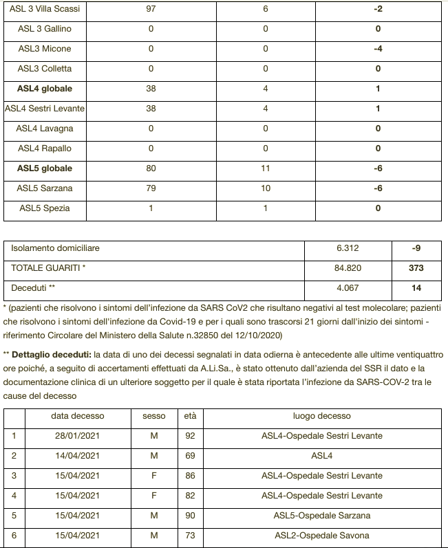 Sono 4.067 i morti con coronavirus in Liguria, con un aumento rispetto a quanto comunicato ieri da Regione Liguria di quattordici (donne e uomini dai 69 a 92 anni) di cui solo cinque decessi si riferiscono alle ultime 24 ore.