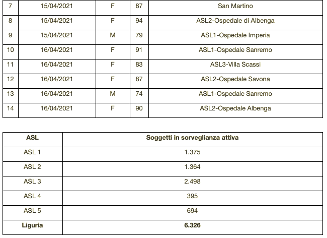 Ecco il bollettino di oggi con tutti i dati ufficiali inviati da Regione Liguria al ministero della Salute.