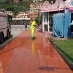 Lavaggio e igienizzazione dei marciapiedi, nel centro di Recco. La pulizia intensiva si protrarrà fino all’autunno.