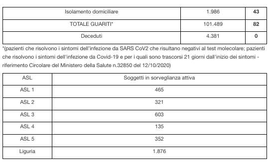I flussi della Liguria sono stati allineati come indicato dall’Istituto superiore di sanitàconsiderando nei casi guariti, oltre ai pazienti che risultano negativi al test molecolare, anche quelli che risolvono i sintomi dell’infezione da Covid-19 e per i quali sono trascorsi 21 giorni dall’inizio dei sintomi previa valutazione di esperti clinici e microbiologi/virologi (riferimento Circolare del Ministero della Salute n. 32850 del 12/10/2020).