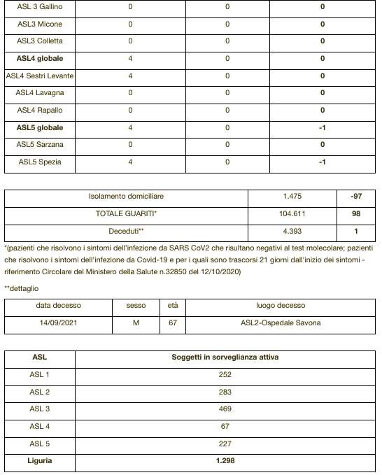 Genova, 16 settembre. Sono 4.393 i morti con coronavirus con un aumento rispetto a quanto comunicato ieri da Regione Liguria di uno (maschio di 67 anni deceduto il 14 settembre all’ospedale di Savona).