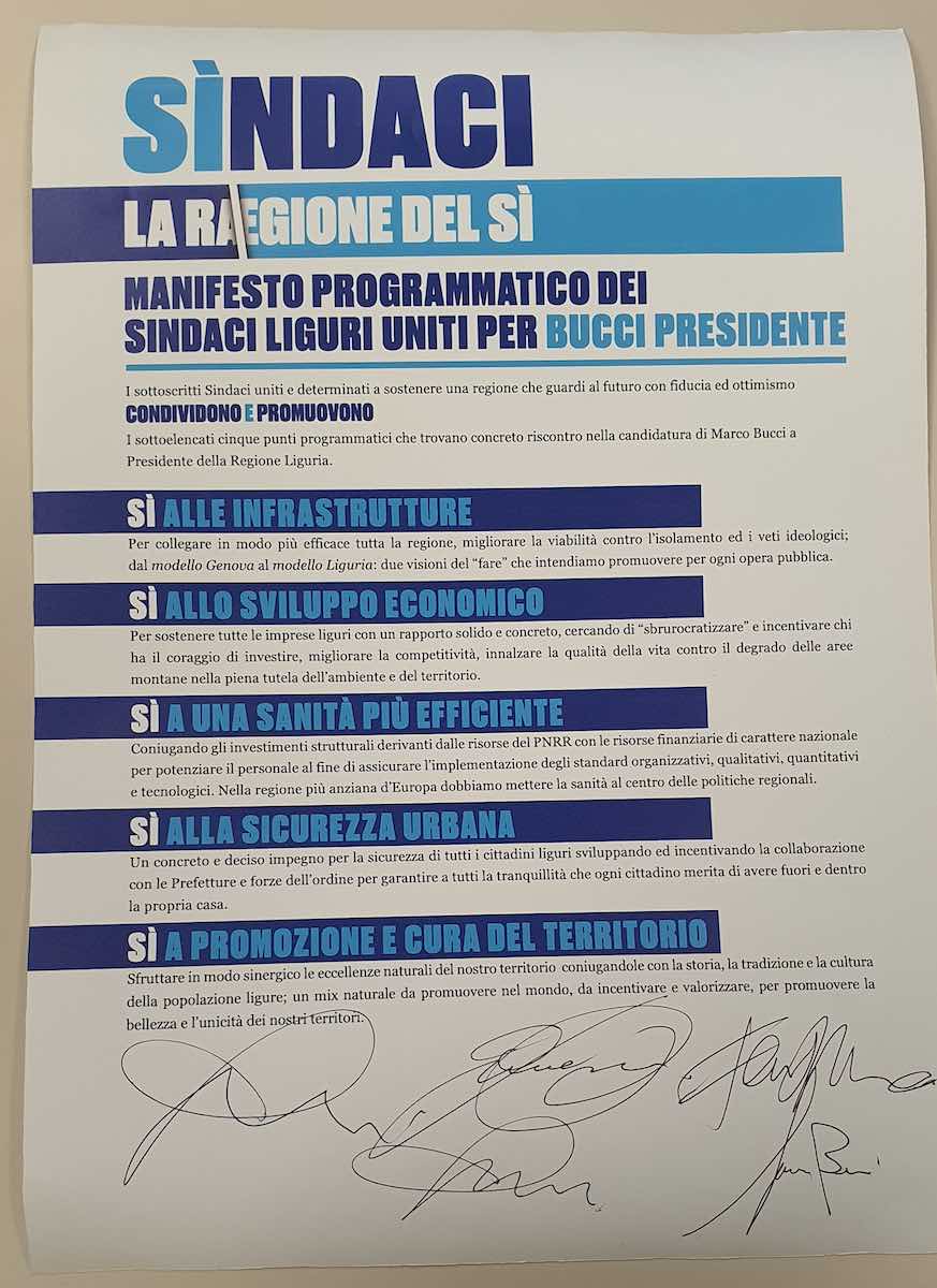 Infrastrutture, sviluppo economico, sanità, sicurezza urbana, promozione e cura del territorio. Questi sono i cinque punti su cui si basa il Patto dei Sindaci – La Regione del Sì, firmato oggi a Genova. Si tratta del manifesto programmatico dei sindaci che sostengono Marco Bucci come Presidente della Regione Liguria.