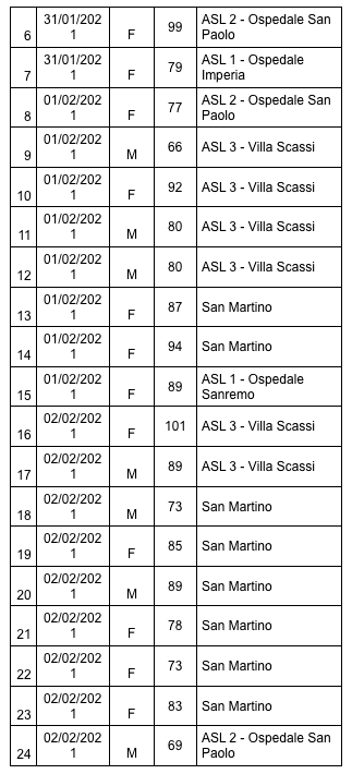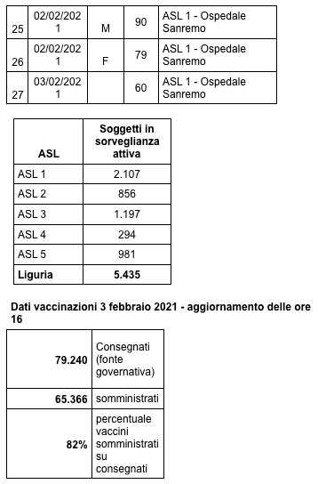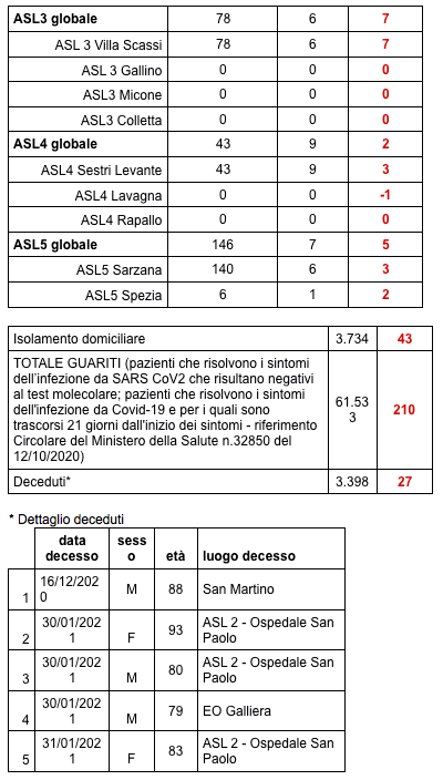 Sono 3.398 i morti con coronavirus in Liguria, con un aumento rispetto a quanto comunicato ieri da Regione Liguria di ventisette (uomini e donne da 60 a 101 anni).