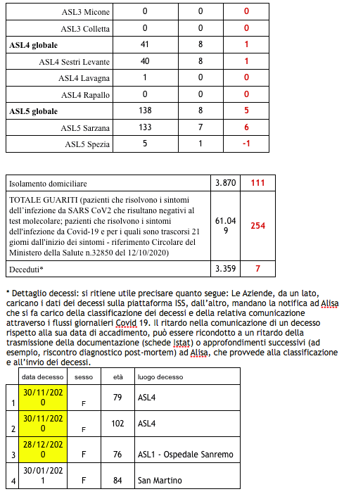 Sono 3.359 i morti con coronavirus in Liguria, con un aumento rispetto a quanto comunicato ieri da Regione Liguria di sette (uomini e donne da 76 a 102 anni). L’ultracentenaria è deceduta l’undici novembre scorso nel territorio dell’Asl 4 Chiavarese, ma il dato, come quelli relativi ad altri due decessi del 2020, è stato fornito soltanto oggi.