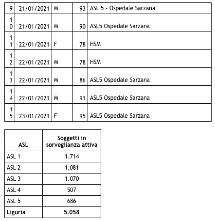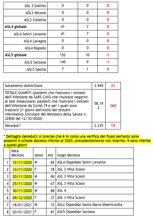 Sono 3.235 i morti con coronavirus in Liguria, con un aumento rispetto a quanto comunicato ieri da Regione Liguria di quindici (uomini e donne da 37 a 95 anni). La 37enne è deceduta al Villa Scassi di Genova Sampierdarena il 9 dicembre scorso.