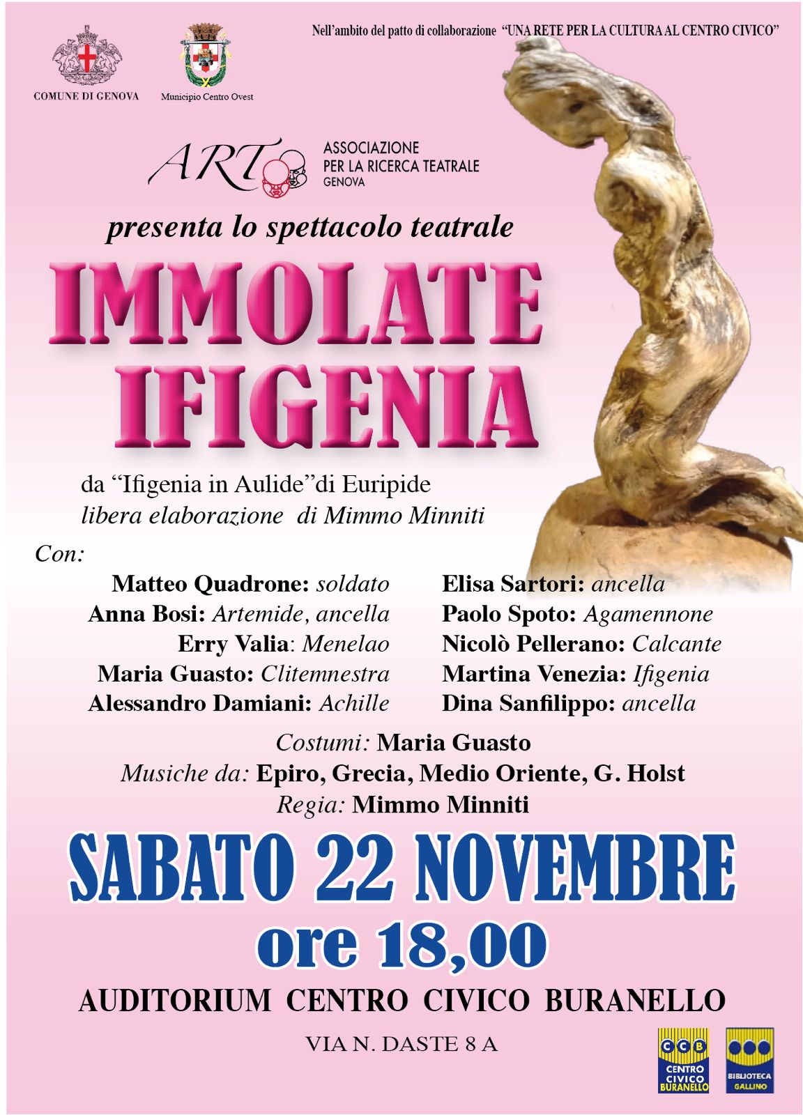 novembre alle 18.00, presso l’Auditorium del Centro Civico Buranello di via N. Daste 8° a Sampierdarena, lo spettacolo teatrale “Immolate Ifigenia”, tratto da “Ifigenia in Aulide” di Euripide, da una libera elaborazione di Minimo Minniti.