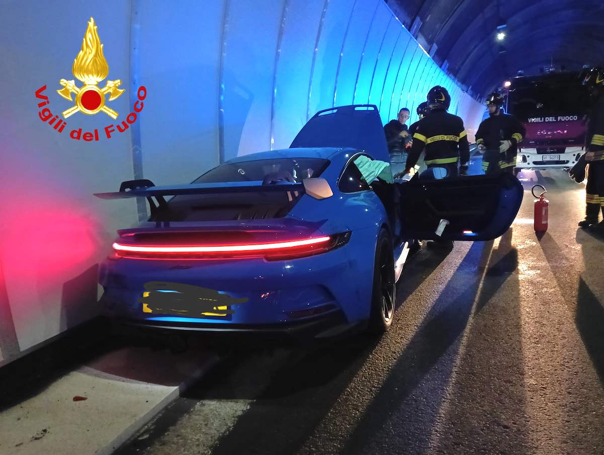 Una vettura, una Porsche 911 GT3, per cause ancora in fase di valutazione, ha perso improvvisamente il controllo mentre transitava in galleria, colpendo la volta del tunnel e fermandosi alla sinistra della carreggiata.