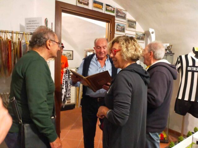 “E’ stato un sabato pomeriggio denso di emozioni al museo- spiegano gli organizzatori- Grazie all’aiuto ed alla collaborazione della sua famiglia, siamo riusciti ad orchestrare una festa a sorpresa per Carabba, il grande portiere che per sei stagioni ha difeso in Serie D la porta della nostra squadra”. Carabba, che dal 1964 al 1970 ha militato nell’Albenga, ha vissuto una carriera lunghissima iniziata nel 1955 nel Popoli e terminata nel 1982, a quasi 43 anni, nel Laigueglia. “Ho giocato per 27 stagioni- racconta Carabba- in quindici squadre diverse: oltre agli anni ad Albenga i ricordi più belli sono quelli legati alle cinque annate con il Pescara in Serie C”. Dopo aver appeso le scarpette al chiodo Carabba ha proseguito per moltissimi anni nel ruolo di preparatore dei portieri,anche dell’Albenga, in diversi periodi: nelle stagioni 1987-88, 1994-95 e 2007-08. Nell’ occasione, l’ Associazione Orgoglio Ingauno, che si prefigge quale scopo principale quello di conservare la storia e ricordare la memoria calcistica cittadina, ha regalato a Carabba una fedele riproduzione della maglia numero uno: la mitica casacca dell’Albenga di quegli anni. A realizzarla in maniera straordinaria sono stati Paolo Grechi e la sua Sartoria Sportiva a Milano, che realizzano fedeli riproduzioni delle storiche casacche dell’Unione Sportiva Albenga. La maglia da portiere nera con la 《V》bianca color panna, ha fatto il suo esordio nelle divise dell’Albenga a partire dalla stagione 1937-38; la indossarono i portieri Augusto Tornago e Giuseppe Aicardi. Questa maglia venne usata, non con continuità e mutando leggermente nel corso dei decenni, fino alla prima metà degli anni Settanta.