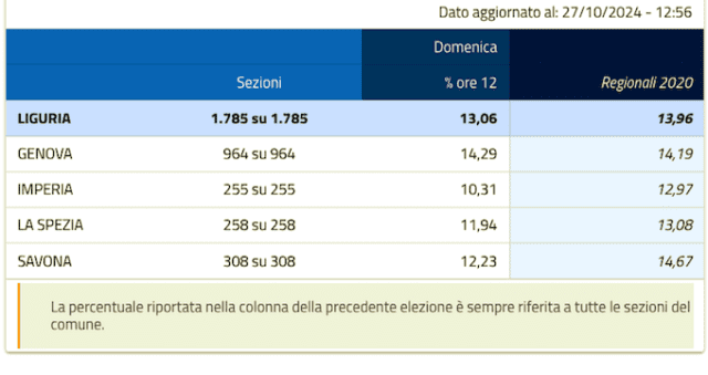 Alle ore 12 di oggi, domenica 27 ottobre, complessivamente nei seggi liguri si è presentato il 13,06% degli aventi diritto (13,96% nel 2020).