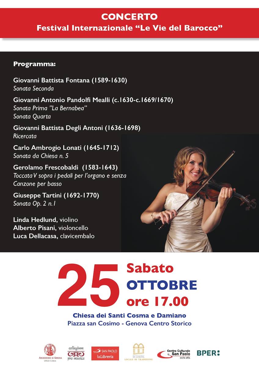 Per festeggiare questo inizio-lavori il Collegium Pro Musica, che da più di vent’anni organizza il Festival Internazionale “Le Vie del Barocco”, ha deciso di rendere gratuita la partecipazione al concerto che si terrà sabato 25 ottobre alle ore 17.00 presso la Chiesa dei Santi Cosma e Damiano, Piazza San Cosimo, Genova – Centro Storico