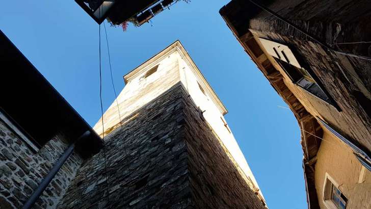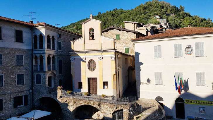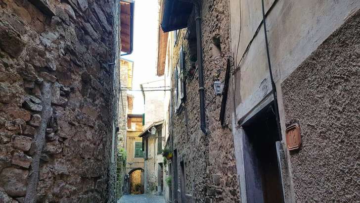 Uno scudo di pietra; antiche case, botteghe e osterie, tutte costruite a ridosso del torrente, archetti in pietra pensili che le collegano tra loro, edicole sacre in stucco sopra le porte di legno delle abitazioni, ringhiere di scale in ghisa decorate con motivi art decò, finestre settecentesche con inferriate piccole quasi a celare l’intimità del borgo.