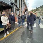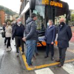 Carlo Gandolfo, sindaco di Recco, con gli assessori Edvige Fanin ed Enrico Zanini, non sono mancati all’appuntamento con l’autobus da 18 metri, veicolo che ha effettuato il viaggio di prova, per verificare la compatibilità con Anas e Polizie Locali, sulla linea Genova – Recco.