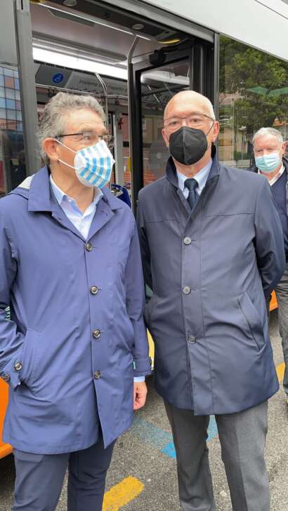 Carlo Gandolfo, sindaco di Recco, con gli assessori Edvige Fanin ed Enrico Zanini, non sono mancati all’appuntamento con l’autobus da 18 metri, veicolo che ha effettuato il viaggio di prova, per verificare la compatibilità con Anas e Polizie Locali, sulla linea Genova – Recco.