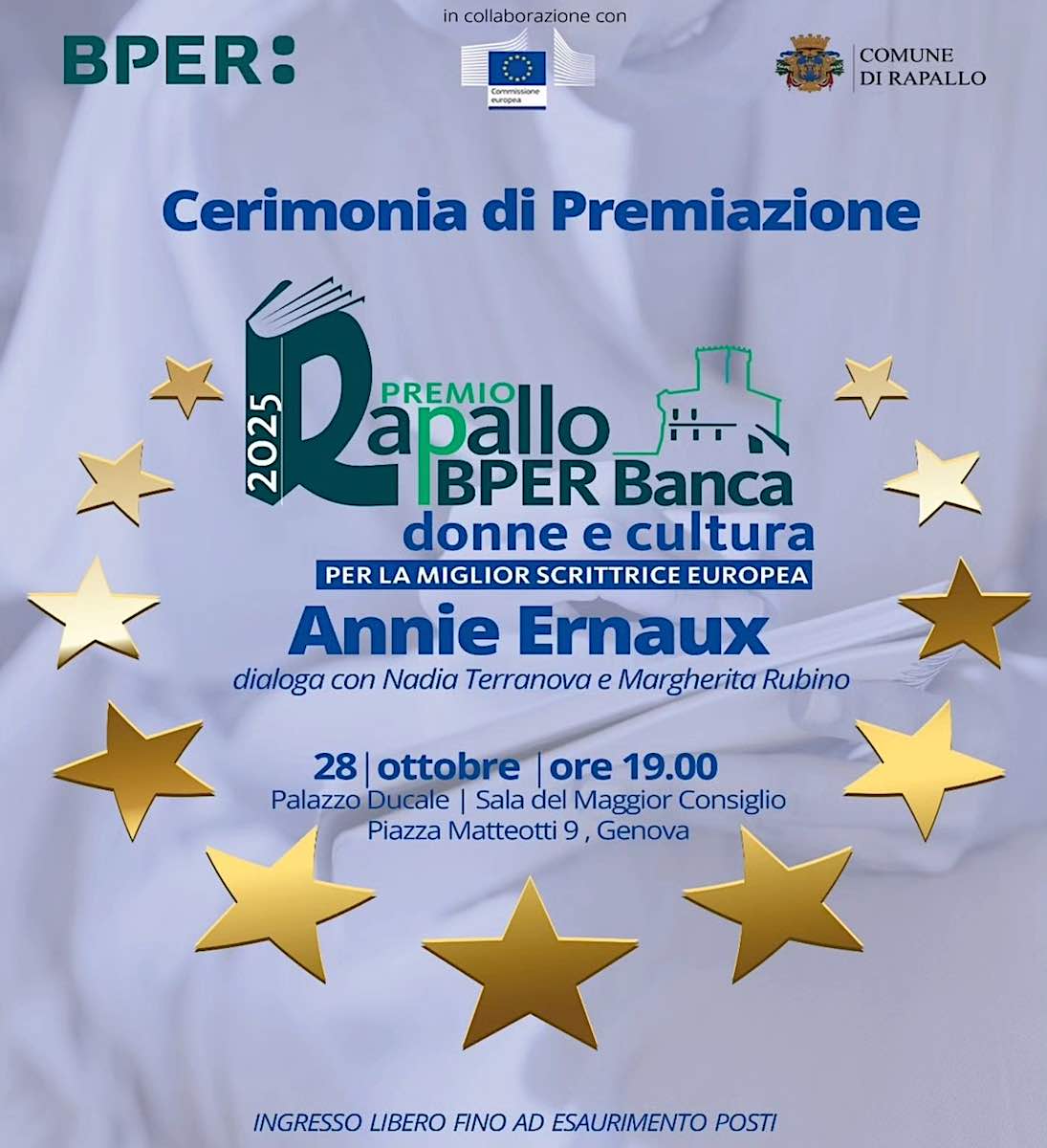 È Annie Ernaux, Premio Nobel per la Letteratura 2022, la vincitrice del Premio Europeo Rapallo BPER Banca 2025 – “La migliore scrittrice europea”. La città di Rapallo celebra così una delle autrici più influenti del panorama letterario contemporaneo, capace di ridefinire il linguaggio narrativo e di esplorare con coraggio la memoria individuale e collettiva.