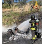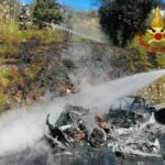 L’auto è andata distrutta con le fiamme che si sono propagate alle sterpaglie vicine