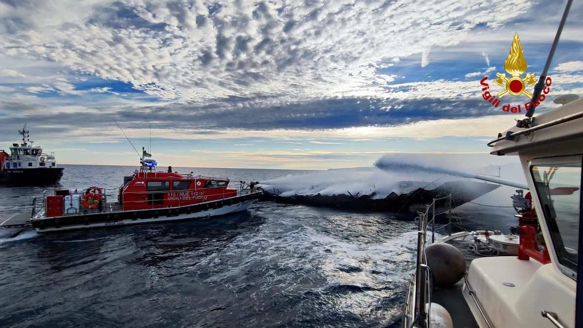 L’imbarcazione in questo momento è trainata dai rimorchiatori verso il porto di porto vado scortata dalla motovedetta della capitaneria di porto e dalla imbarcazione dei vigili del fuoco del comando di Savona. L’imbarcazione VF di GE ha fatto rientro.