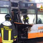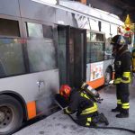 I controlli dei vigili del fuoco dopo lo spegnimento delle fiamme sul bus