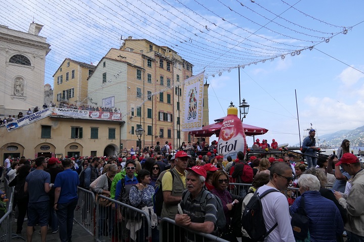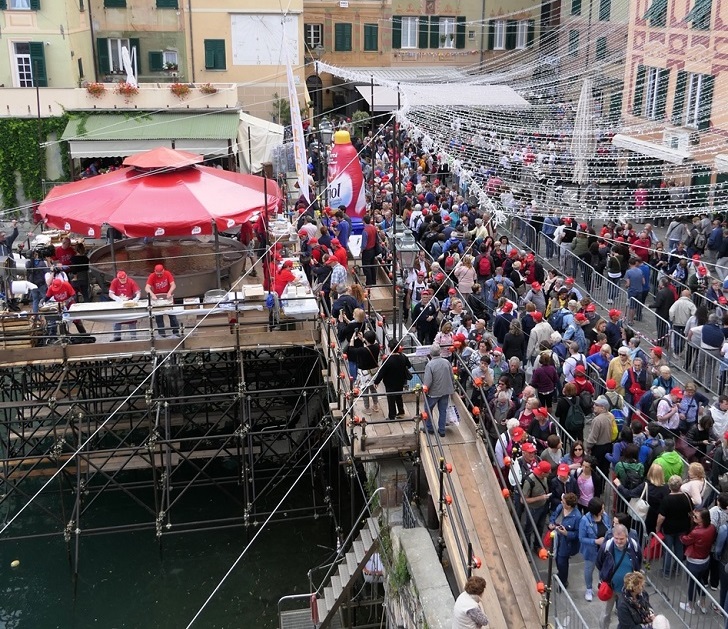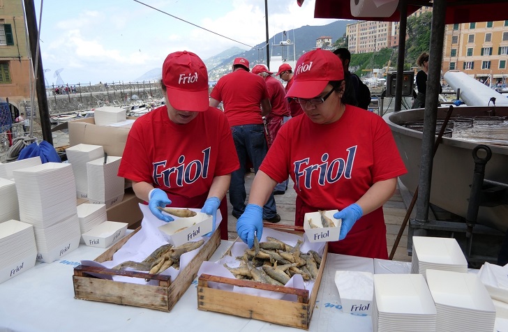 Nel padellone sono stati fritti circa 30 quintali di pesce azzurro in oltre 3.000 litri di olio. Migliaia di ospiti provenienti da tutta Italia si sono messi ordinatamente in fila per accaparrarsi le ambite vaschette, ecologiche e biodegradabili, colme di pesce fritto e croccante, offerto dalla Cooperativa Pescatori di Camogli e da Martini & C. Il fritto è stato distribuito in più riprese grazie anche all’impegno dei molti volontari presenti.