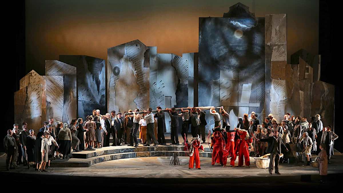 Il numeroso coro si impone da onnipresente protagonista, quasi a rappresentare la potenza dei condizionamenti sociali, delle tradizioni e comportamenti imposti che non sempre si allineano all’umanità e al buon senso.