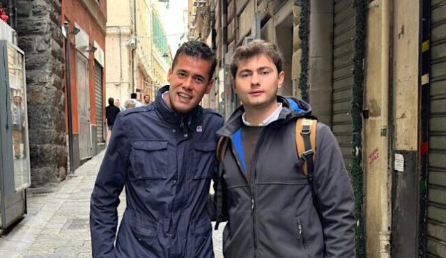 Edoardo Di Cesare con il vice segretario della Lega Andrea Crippa nei caruggi di Genova