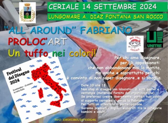 Ceriale. La Pro Loco Ceriale, con il Patrocinio del Comune di Ceriale e la collaborazione dell’ Unitre Comprensoriale Ingauna sezione di Ceriale organizza per la seconda volta, dopo il grande successo ottenuto nell’edizione del 2023, “All Around Fabriano”, un vero e proprio Festival del disegno sponsorizzato da Fabriano. “Si tratta – ci spiega la presidente della Pro Loco Livia Boano– di un evento nazionale a cui abbiamo aderito con piacere. Il programma prevede laboratori didattico artistici, aperti a tutti, guidati da insegnanti qualificati. L’intento è quello di far emergere la creatività e la fantasia artistica di chiunque voglia mettersi alla prova. Per questo invitiamo tutti a partecipare”. L’evento denominato: “Proloc’Art un tuffo nei colori” si svolgerà nella giornata di sabato 14 settembre sul Lungomare Armando Diaz, nella zona della suggestiva Fontana San Rocco con il seguente orario: dalle ore 10 alle 18 verranno attivati laboratori d’arte con insegnanti qualificati che potranno insegnare ai bambini, ai ragazzi ed a chiunque voglia a disegnare e dipingere ed a dare libero sfogo alla propria creatività. A tutti i partecipanti verrà rilasciato un attestato di partecipazione.