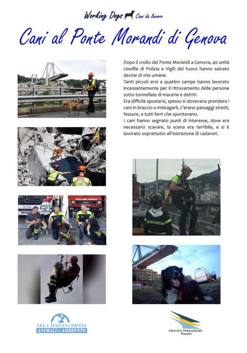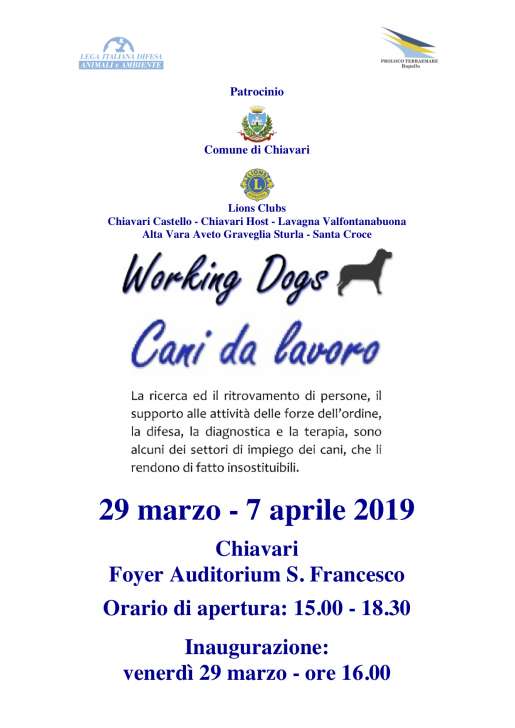 La mostra “Working Dogs” (cani da lavoro), arriva alla sua terza tappa. La LEIDAA (Lega Italiana Difesa Animali e Ambiente) e la Pro Loco Terraemare, con il patrocinio del Comune Chiavari, ripropongono l’esposizione, anche grazie al successo riscontrato a Santa Margherita Ligure ed alle scuole medie dell’Istituto Comprensivo di Rapallo.