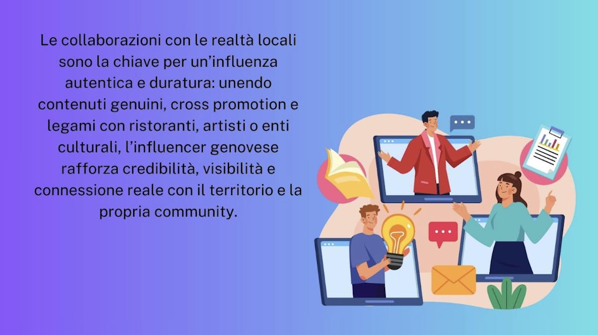 Il successo di un influencer genovese si basa sicuramente sulla capacità imprenditoriale, sullo studio di Instagram e sulla cura dei contenuti, ma in base al target di riferimento può rivelarsi fondamentale stringere degli accordi con le realtà locali: ristoranti, artigiani, artisti ed enti culturali risultano fondamentali per ampliare la visibilità e rafforzare la credibilità del creator.