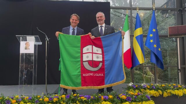 L’assessore regionale Marco Scajola ha consegnato la bandiera di Regione Liguria all’ambasciatore svedese in Italia in occasione dell’apertura del nuovo Consolato onorario a Sanremo