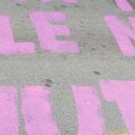 Sull’asfalto con uno spray viola è comparsa la scritta “Sul nostro corpo decidiamo noi”.