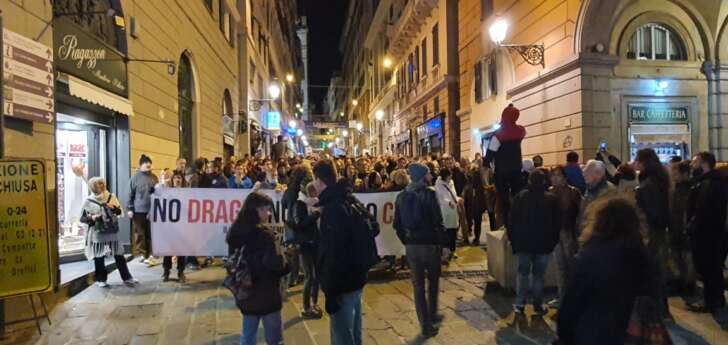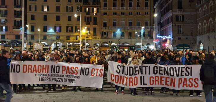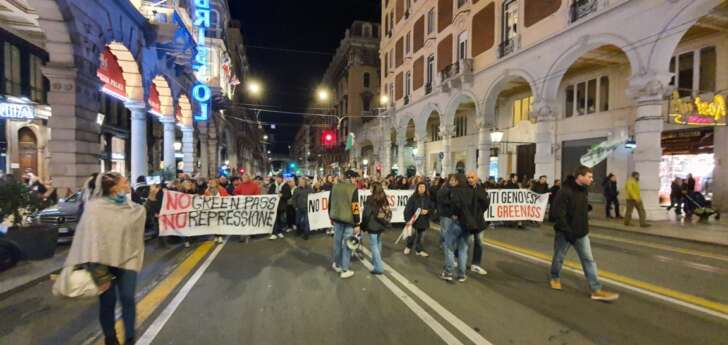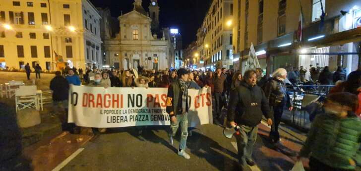 Il corteo sta percorrendo via XX Settembre in direzione piazza De Ferrari. Ad aprire il corteo tre striscioni “No Green pass, no repressione”, “No Draghi No pass No CTS. Il popolo e la democrazia trionferanno – Libera piazza Genova” e “Studenti genovesi contro il Green pass”.