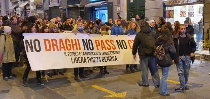 Alle 18.30 il corteo No Green pass è partito da piazza della Vittoria e, malgrado il freddo pungente e un vento che spira sulla città, stanno attraversando il centro di Genova.