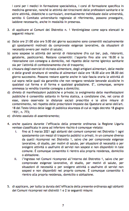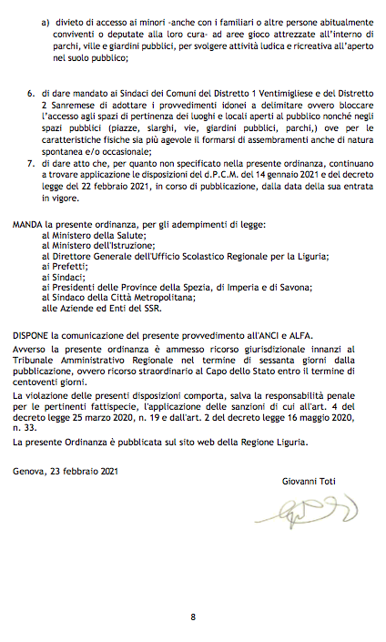 Area di criticità rossa o, come alcuni la definiscono, zona “arancione rafforzata” da Sanremo a Ventimiglia. Ecco la copia del testo della nuova ordinanza anti Covid annunciata ieri e firmata oggi dal governatore ligure Giovanni Toti.