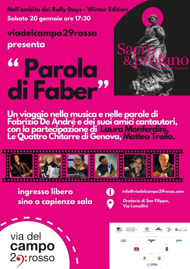 Nell’ambito delle manifestazioni per l’ “anno deandreiano” a 25 anni dalla scomparsa dell’indimenticato e indimenticabile Faber avvenuta l’11 gennaio 1999, domani pomeriggio, sabato 20 gennaio, concerto tributo al grande Faber del gruppo “Le Quattro Chitarrre”. Nel contenuto dei “Rolli Days Winter Edition”, appuntamento presso l’Oratorio della Chiesa di San Filippo in Via Lomellini dalle 17:30.