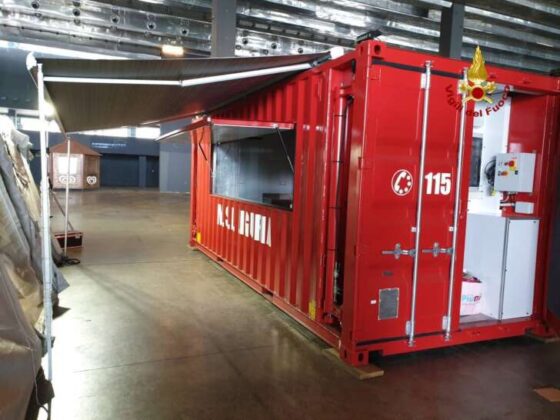 Oltre alla prova di montaggio delle tende pneumatiche, è stata messa in opera la nuova cucina installata in un modulo container facilmente trasportabile.