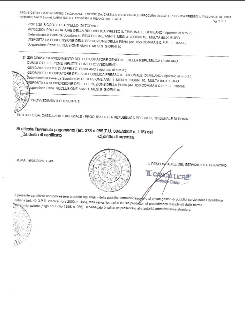 È il documento che serve a chiunque aspiri a un posto pubblico, e che serve a dimostrare di essere incensurato. In questo caso, il documento dimostra che la Salis incensurata non è.