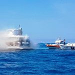 Dall’alto anche un velivolo della base elicotteri di Sarzana per monitorare le operazioni di disinquinamento che sono attualmente in corso, vista la leggera iridescenza che si è determinata nello specchio acqueo dopo l’affondamento dell’unità.