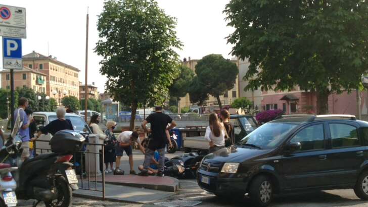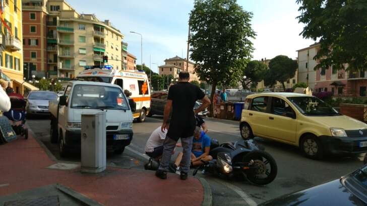 Uno scooter è entrato in contatto con un’auto, una Fiat Panda nera ed è finito a terra.