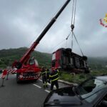 Il mezzo è finito nella proprietà privata adiacente alla strada, richiedendo un intervento tecnico particolarmente delicato da parte dei Vigili del Fuoco. Sul posto è intervenuta una squadra del Comando provinciale di Savona, supportata dal mezzo speciale 11R dotato di gru, utilizzato per mettere in sicurezza il veicolo e l’area circostante.