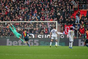 La punizione è battuta da Malinovskyi, che sistema la palla e fa partire una fiondata che si infila a mezza altezza nella porta ospite, con Ravaglia – forse freddo – non esente da clpe: è il 2-1 ed a questo punti il Grifone tira fuori gli artigli.