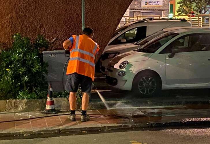 Lavaggio e igienizzazione dei marciapiedi, nel centro di Recco. La pulizia intensiva si protrarrà fino all’autunno.