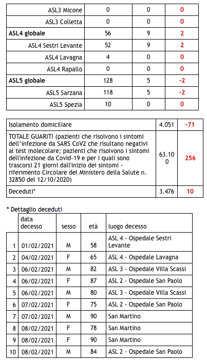 Sono 3.476 i morti con coronavirus in Liguria, con un aumento rispetto a quanto comunicato ieri da Regione Liguria di dieci (uomini e donne da 58 a 90 anni).