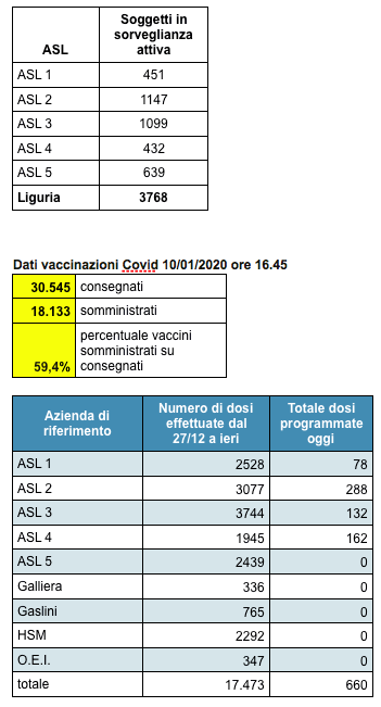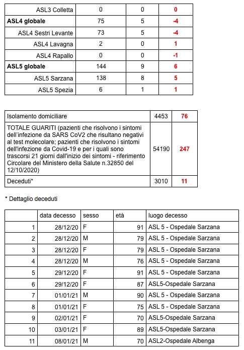 Sono 3010 i morti con coronavirus in Liguria, con un aumento rispetto a quanto comunicato ieri di undici (uomini e donne da 70 a 91 anni).