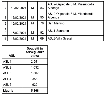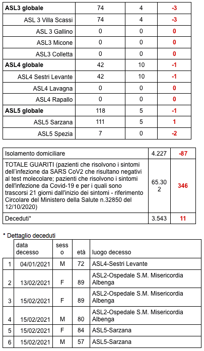 Sono 3.543 i morti con coronavirus in Liguria, con un aumento rispetto a quanto comunicato ieri da Regione Liguria di undici (uomini e donne da 57 a 95 anni).