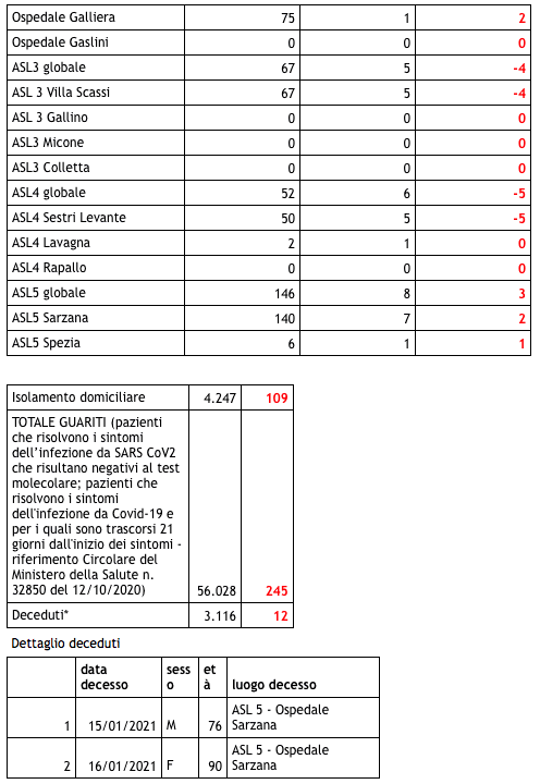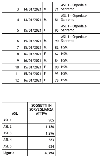 Sono 3116 i morti con coronavirus in Liguria, con un aumento rispetto a quanto comunicato ieri di dodici (uomini e donne da 62 a 95 anni).