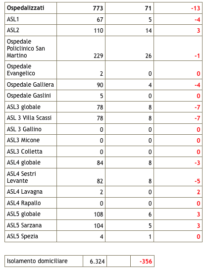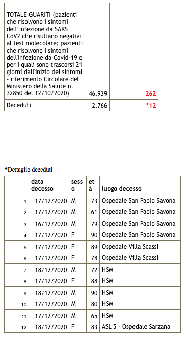 Sono 2.766 i morti con coronavirus in Liguria, con un aumento rispetto a quanto comunicato ieri di dodici (donne e uomini da 61 a 90 anni).