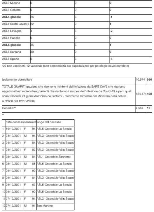 Sono 4.567 i morti con coronavirus con un aumento rispetto a quanto comunicato ieri da Regione Liguria di dodici (femmine di 63, 81, 83, 84, due di 90 e due di 91 anni e maschi di 81, 85 e due di 91 anni).