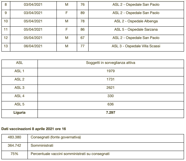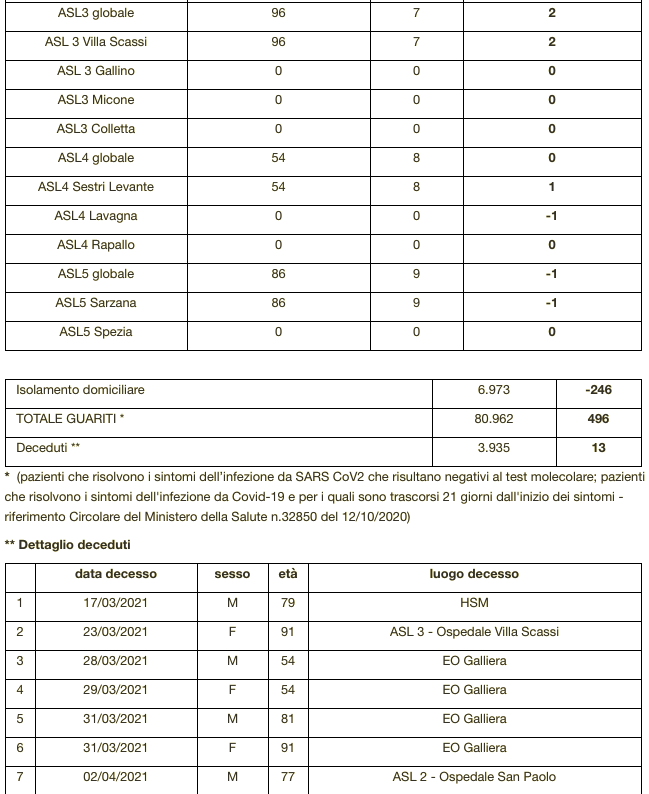 Sono 3.935 i morti con coronavirus in Liguria, con un aumento rispetto a quanto comunicato ieri da Regione Liguria di tredici (donne e uomini dai 54 agli 91 anni) di cui nessun decesso si riferisce alle ultime 24 ore.