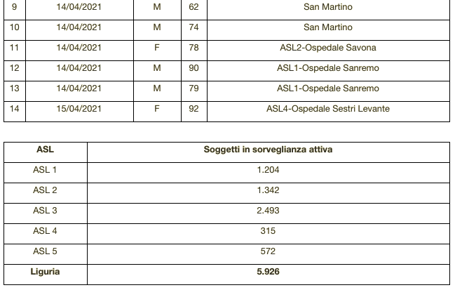 Ecco il bollettino di oggi con tutti i dati ufficiali inviati da Regione Liguria al ministero della Salute.