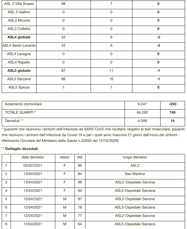 Sono 4.046 i morti con coronavirus in Liguria, con un aumento rispetto a quanto comunicato ieri da Regione Liguria di quattordici (donne e uomini dai 62 a 96 anni) di cui solo sei decessi si riferiscono alle ultime 24 ore.